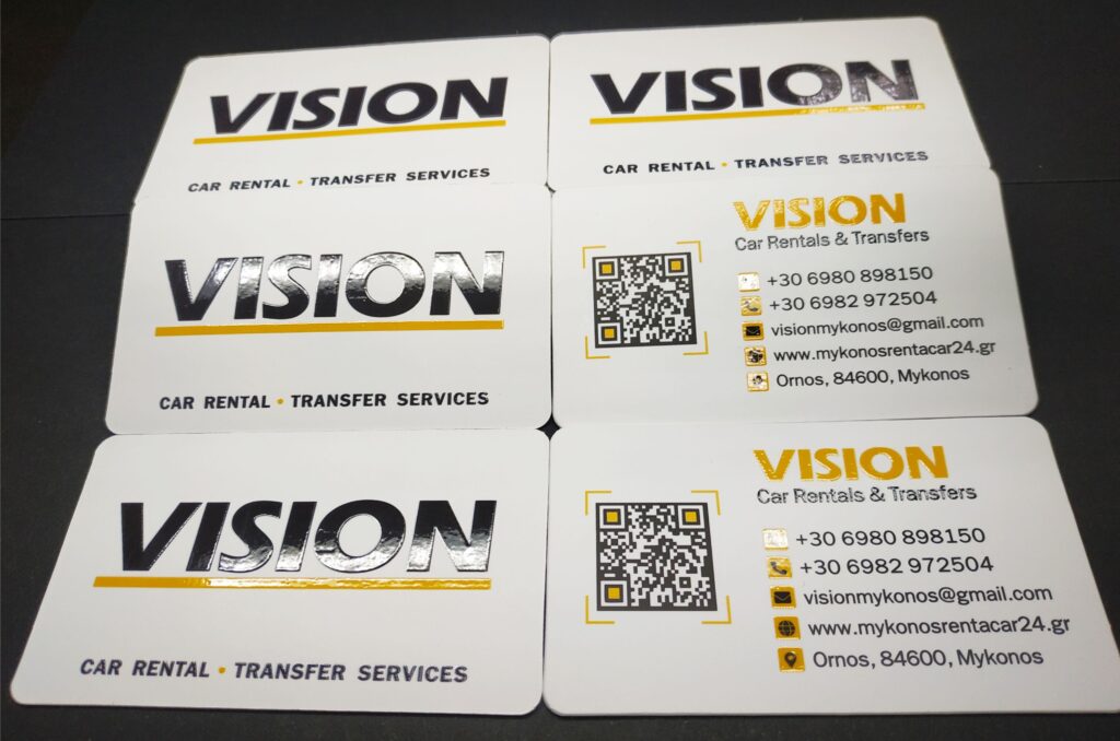 έγχρωμη αμφίπλευρη εκτύπωση με ανάγλυφο spot UV 2 όψεων, ματ πλαστικοποίηση, λαμιναριστές 700γρ